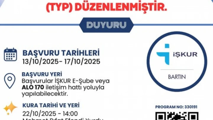 İŞKUR tarafından yapılan açıklamaya göre, programa başvurular 13-17 Ekim 2025 tarihleri arasında alınacak. Başvuru yapmak isteyen vatandaşlar, İŞKUR e-Şube üzerinden ya da ALO 170 hattını arayarak işlemlerini gerçekleştirebilecek.