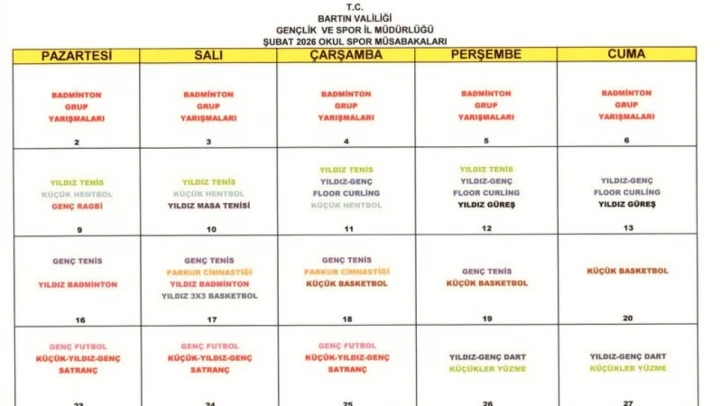Bartın Gençlik ve Spor İl Müdürlüğü, Şubat 2026 Okul Spor Müsabakaları kapsamında çocuklar ve gençler için hazırladığı kapsamlı spor faaliyet takvimini kamuoyuyla paylaştı. Bartın genelinde düzenlenecek organizasyonlarla birlikte spor dolu bir hafta öğrencileri bekliyor.