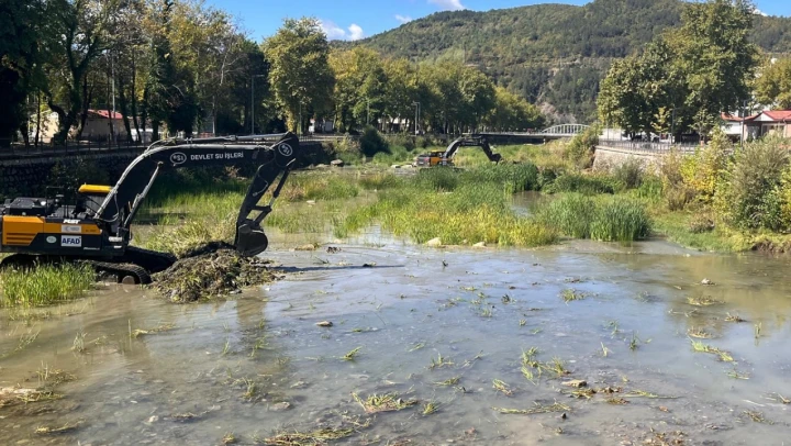 Ulus ilçesinde Devlet Su İşleri (DSİ) ekipleri tarafından Ulus Çayı dere yatağında temizlik ve ıslah çalışmaları aralıksız sürüyor.