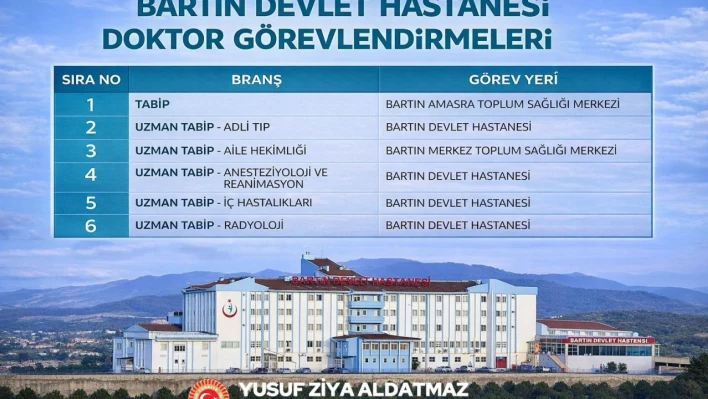 Ocak Dönemi İller Arası Atamalar kapsamında Bartın'ın sağlık altyapısı güçlenmeye devam ediyor. AK Parti Bartın Milletvekili Yusuf Ziya Aldatmaz'ın açıkladığı yeni atamalarla birlikte, Bartın'daki sağlık kuruluşlarında görevlendirilmek üzere 5'i uzman, 1'i tabip olmak üzere toplam 6 hekim göreve başlıyor. Adli Tıp, Aile Hekimliği, Anesteziyoloji ve Reanimasyon, İç Hastalıkları ve Radyoloji branşlarında yapılan atamalarla başta Bartın Devlet Hastanesi olmak üzere il genelinde sağlık hizmetlerinin kalitesinin artırılması hedefleniyor.