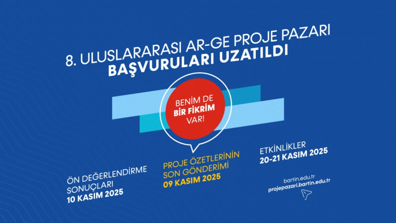 Bartın Üniversitesinin (BARÜ) yenilikçi fikirleri bir araya getireceği '8. Uluslararası Ar-Ge Proje Pazarı'nın başvuru süresi gelen talepler üzerine uzatıldı. Ar-Ge Proje Pazarı Düzenleme Kurulu'nun aldığı karar doğrultusunda organizasyonun son başvuru tarihi 9 Kasım 2025 olarak güncellendi.